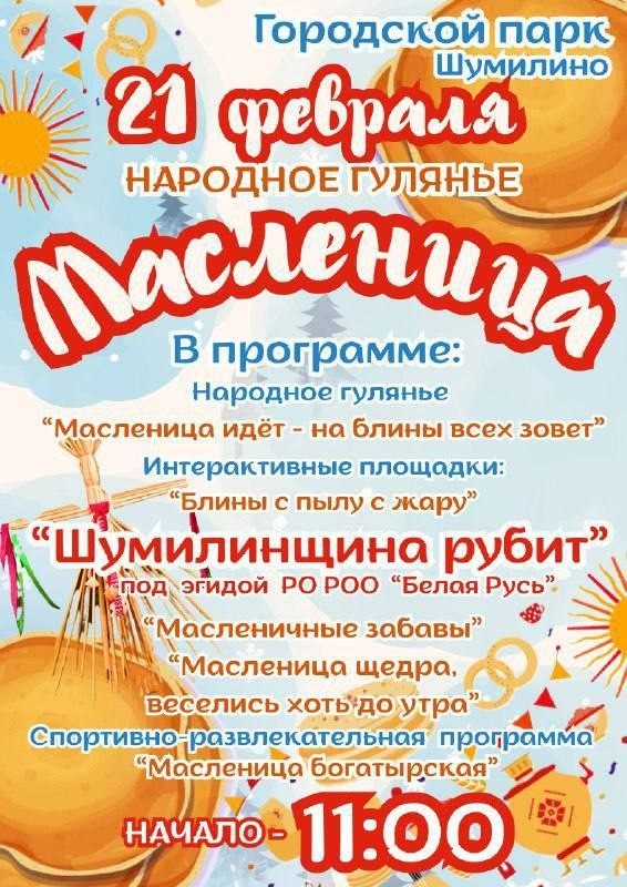 21 февраля приглашаем жителей и гостей Шумилино на долгожданное и всеми любимое народное гулянье — Широкую Масленицу!